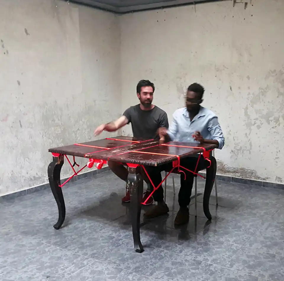 Second-hand wood table disassembled and assembled again with metal folding mechanism. Folding table for Luis Amalia performances scenography Stillframes Luis Amalia and Kace Monney in the Juan Gallery, Madrid. Luis Amalia in Espacio DT, Madrid.
